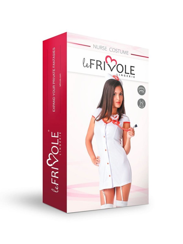 Костюм состоит из клас­си­че­ского бело­снеж­ного хала­тика на пуго­вич­ках и медицин­ского чепца. Хала­тик с пажами для чулок, что при­дает образу осо­бую пикантность!